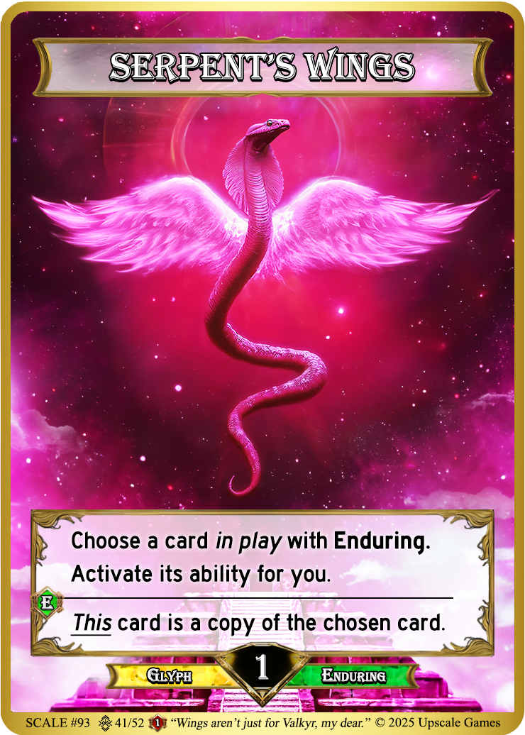 Clarification | Cannot choose a card that has lost its Enduring ability. The copy status of Serpent's Wings remains even if the card it copied is removed from play. |